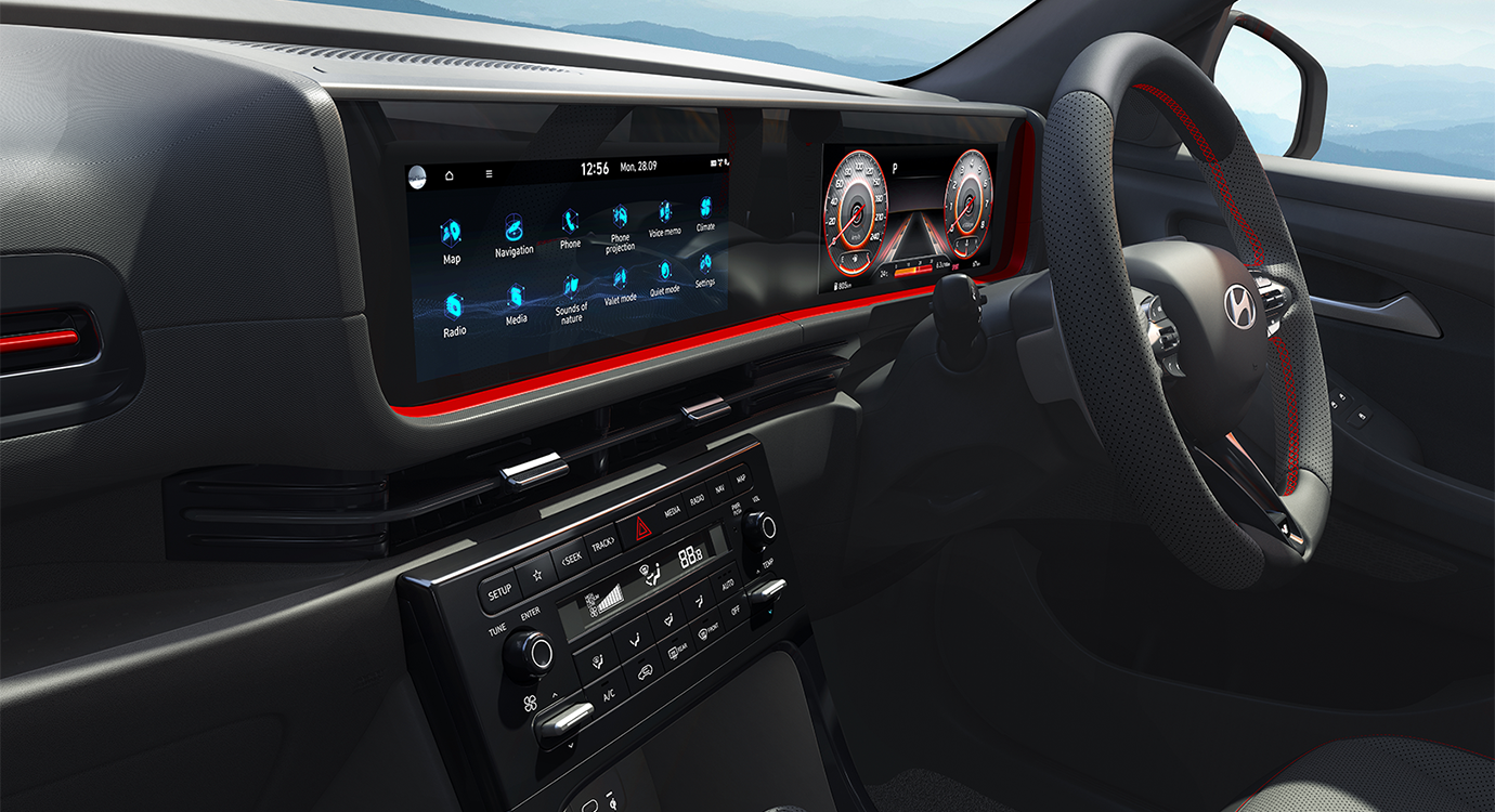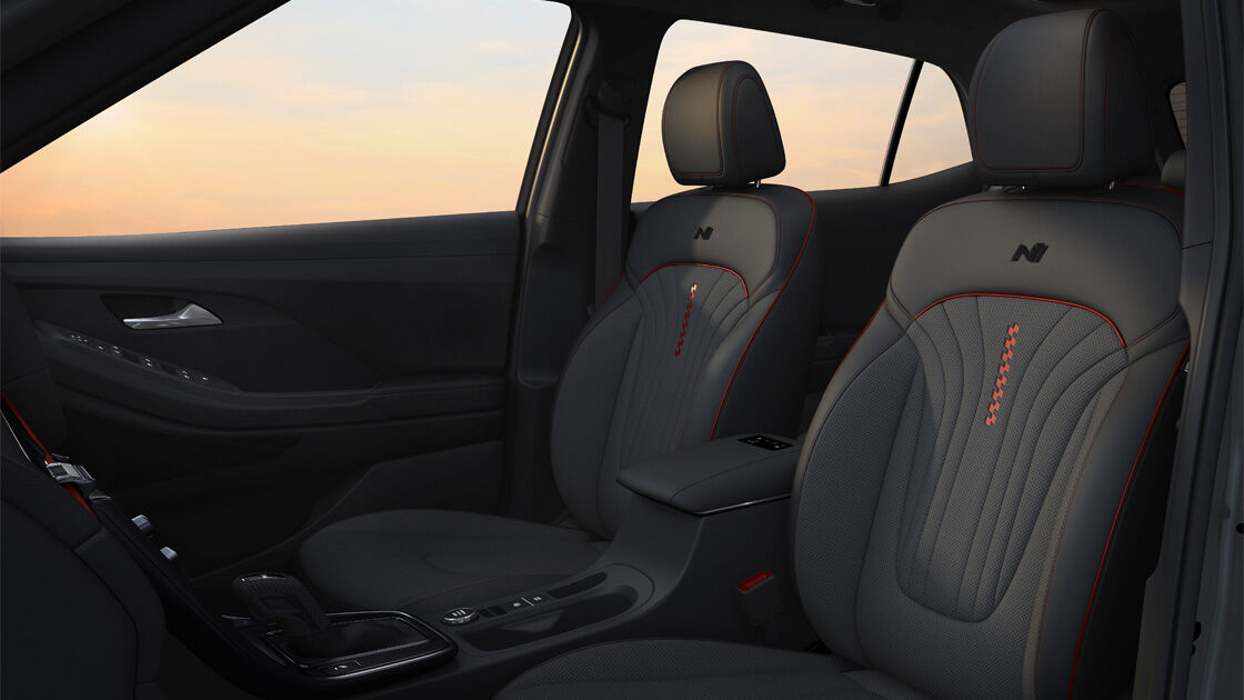 Interior & KenyamananJok kulit dengan jahitan merah khas N Line, pedal sport, setir berlogo N Line, ambient lighting, kabin lega dengan finishing premium